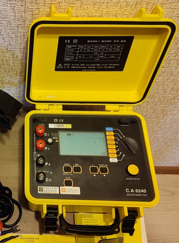 The 10A Micro-Ohmmeter Model 6240 is a rugged, low resistance tester designed for both plant maintenance and field use. Utilizing a four-lead Kelvin method of testing, the Model 6240 Micro-Ohmmeter accurately measures very low resistance within 0.25%.Resistance measurements are automatically calculated from 1µΩ to 400Ω with resolutions down to 1µΩ. The Model 6240 has selectable test currents of 10A, 1A, 100mA and 10mA and includes a polarity reversal function. The Model 6240 is designed to conduct tests on both resistive and inductive material. Up to 99 measurements can be stored and printed directly to a printer or from a PC.
