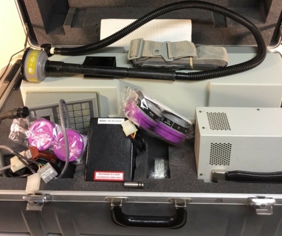 This unit is complete with Wheeled Case, battery charger and cables, AC power cord, sample line, manual, 2 filters for use while sampling, and two filters used for providing clean air to the unit during the zeroing process, shoulder strap, certification papers and sticker on unit, and one rebuilt battery pack.