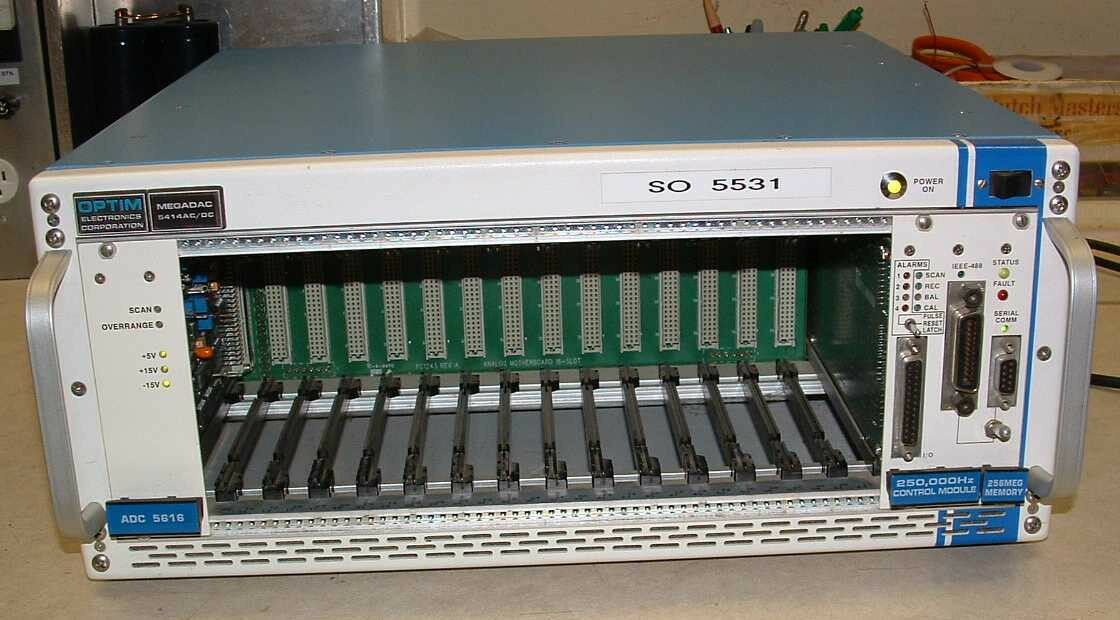 Megadac 5414 AC/DC system and includes the rack, power supply, back up battery, 250 K measurement/sec. control unit, 256 MB of memory, ADC 5516 A/D converter, user’s manual, and the PC software package TCS for windows v3.4.